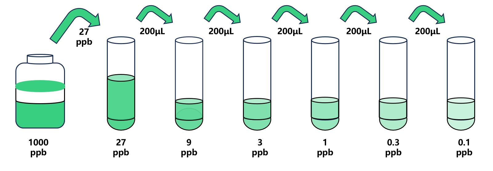 試劑盒中取出標準品,準備7個試管,先將1000ppb標準品(200µL)按需吸取一定量用1×稀釋液稀釋至27ppb(例:27µL的標準品母液+973µL的1×稀釋液,制備得到1000μL的27ppb濃度標準品),隨后在5個試管中分別加入400μL的1×稀釋液,在這5個單獨的試管中將27ppb標準品依次3倍倍比稀釋至5個梯度,共配制6個濃度的標準品,依次為:27ppb、9ppb、3ppb、1ppb、0.3ppb、0.1ppb,從最高濃度標準品溶液中吸取200μL標準品到下一個試管中,輕輕吹打混勻,以此類推進行標準品的倍比稀釋(如圖所示),1×稀釋液用作零濃度標準品(0ppb)。